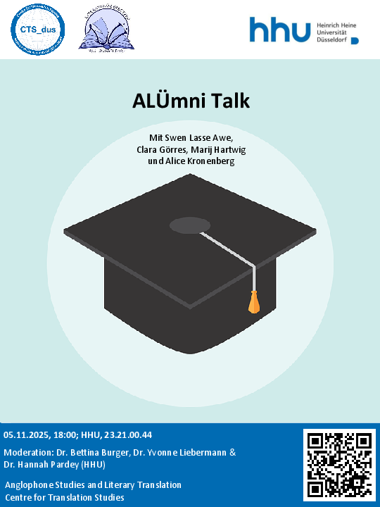 Was kommt nach dem Studium des Literaturübersetzens? Im Rahmen des ALÜmni Talk berichten ehemalige Studierende von ihren persönlichen Wegen: von der Studienwahl und prägenden Stationen im Studium bis hin zu den ersten Schritten ins Berufsleben. Das Publikum ist herzlich eingeladen, Fragen zu stellen, sich auszutauschen und wertvolle Tipps aus erster Hand mitzunehmen.